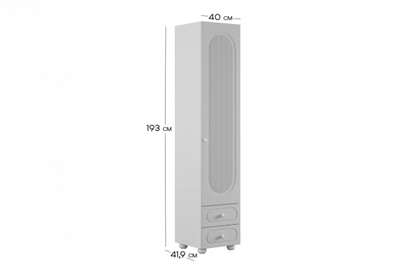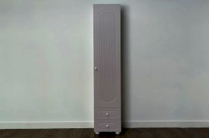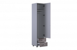Модуль оснащён одной распашной дверцей и двумя вместительными выкатными ящиками в нижней части, предназначенными для хранения одежды, текстиля или аксессуаров. Внутреннее наполнение можно выбрать в зависимости от потребностей: шкаф может быть укомплектован полками или штангой для плечиков, что делает его удобным для хранения как сложенных вещей, так и одежды на вешалках.