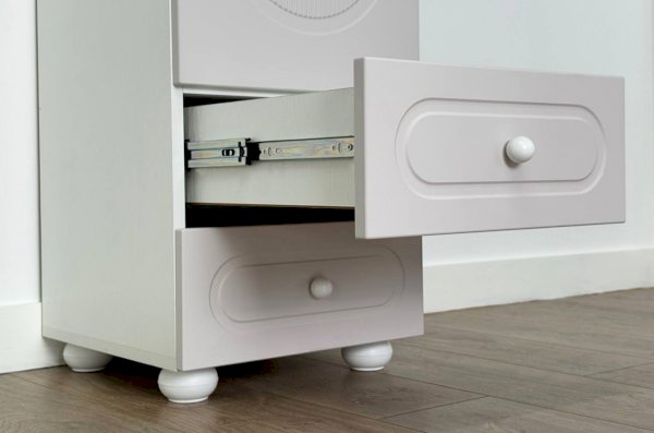 Корпус выполнен из ЛДСП толщиной 16 мм, фасад изготовлен из МДФ в плёнке ПВХ и декорирован фрезеровкой, подчёркивающей стиль серии Милана. Оригинальные круглые ручки и опоры дополняют дизайн, придавая шкафу аккуратный и современный внешний вид.